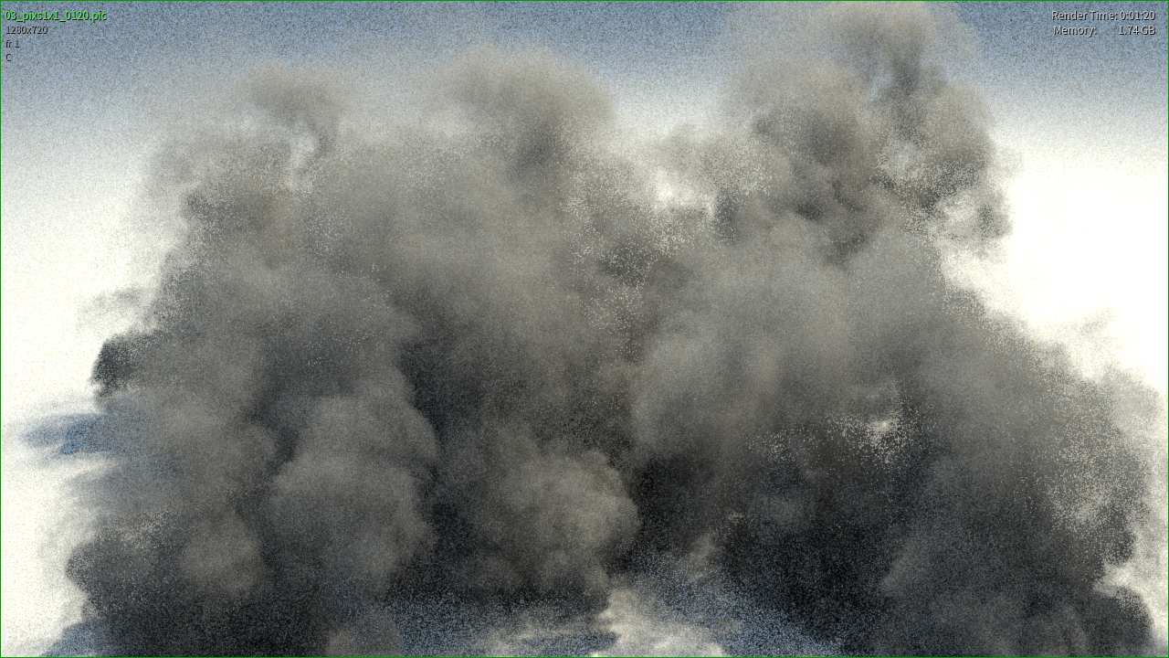 | Pixel Samples を 2x2 に増加. 全体的なノイズは減ったが、ピクセルサンプルが低いと雲全体が暗く見える。ピクセルサンプルは変更しない方が良いかもしれない。 |